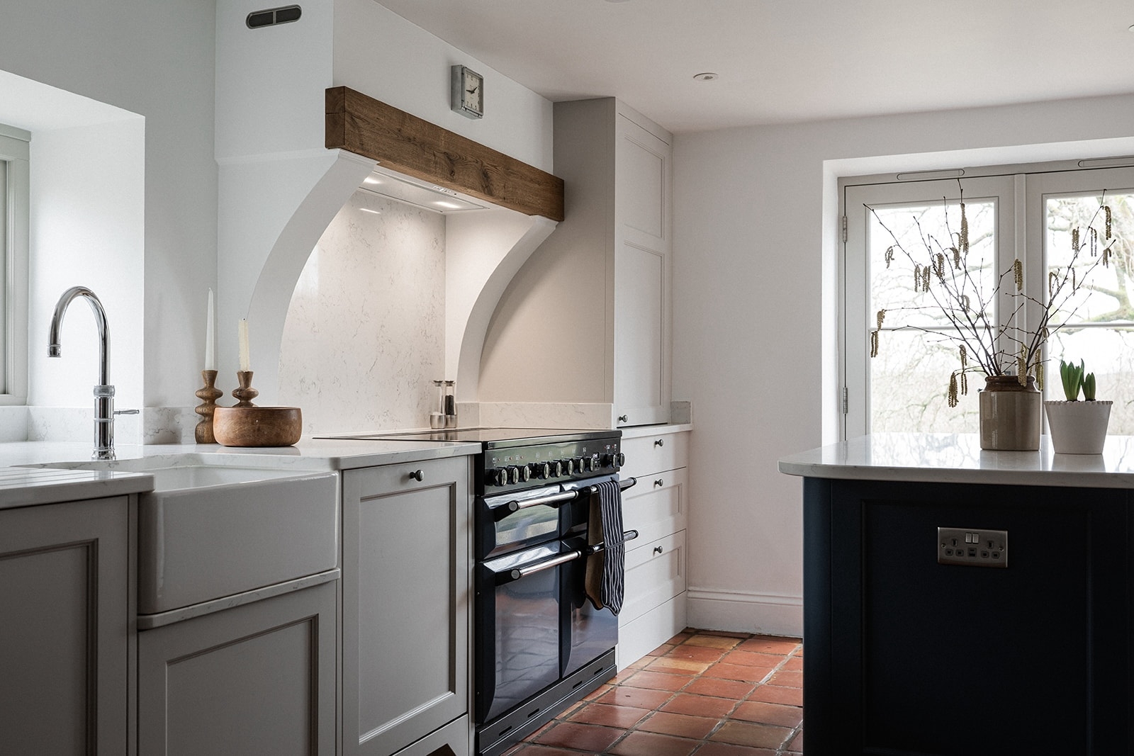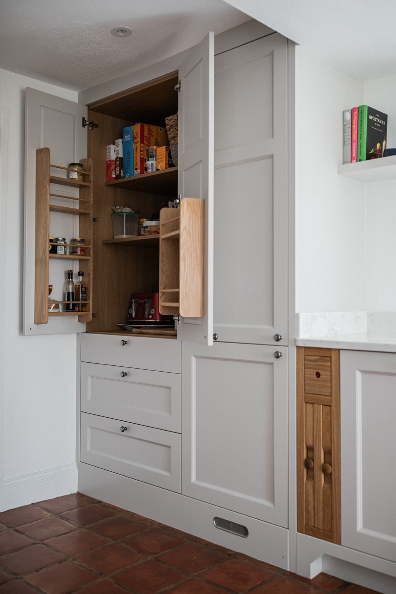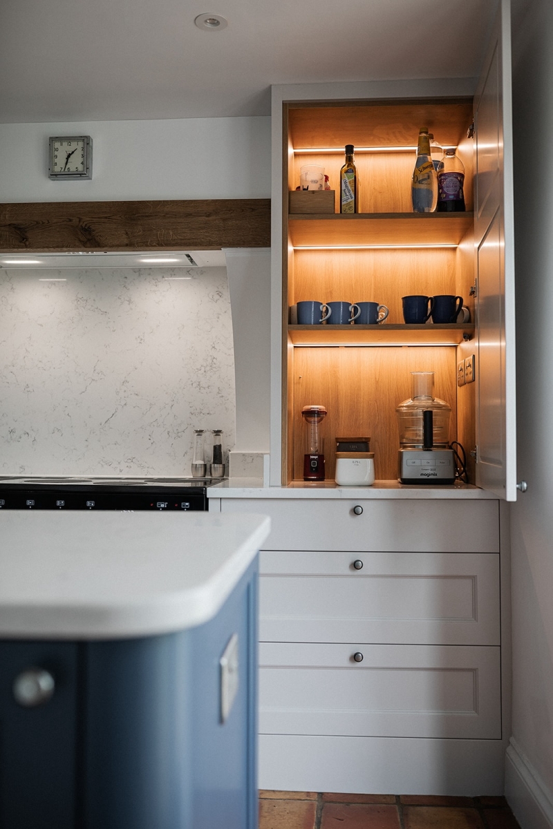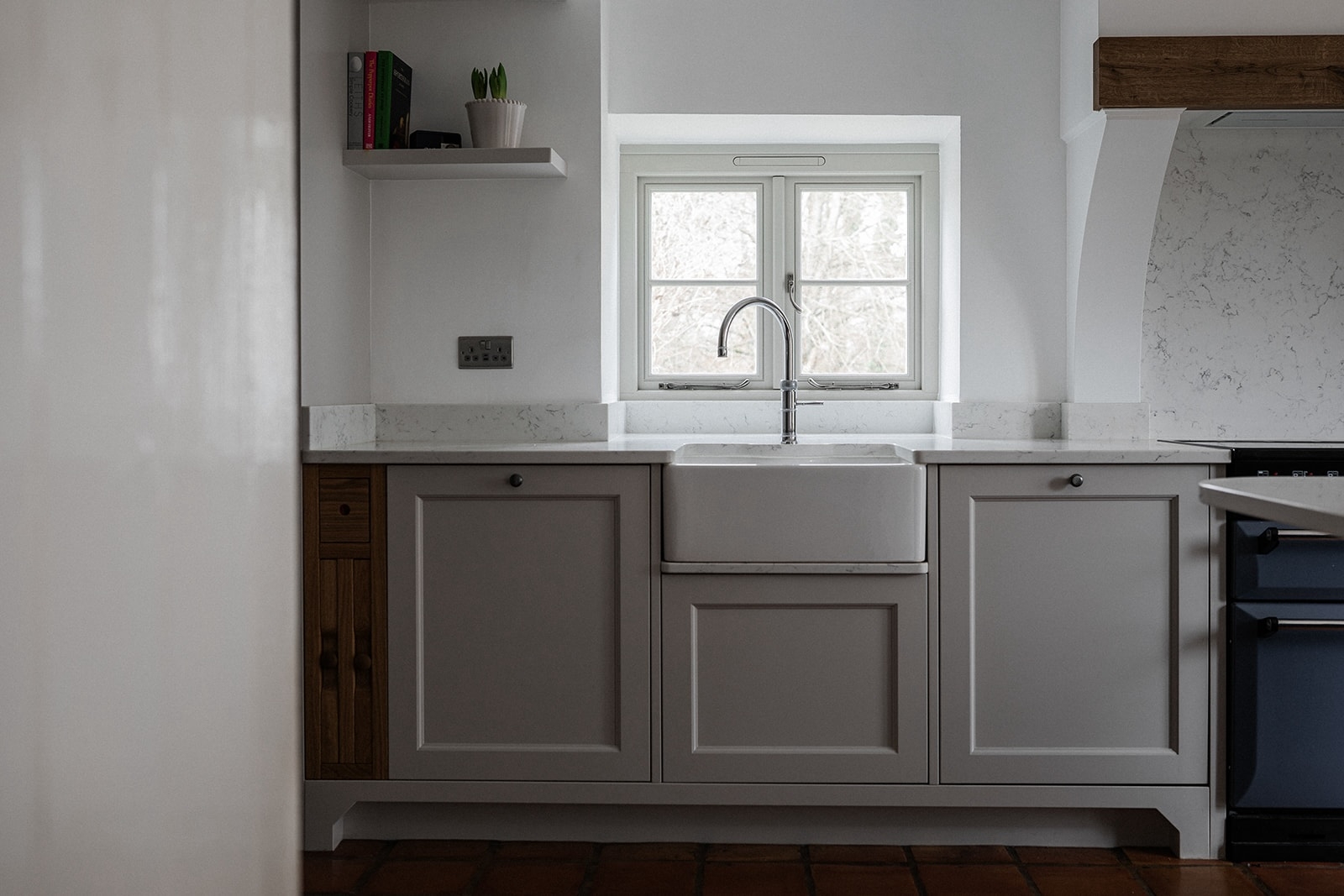 A Belfast sink paired with a Quooker tap provides a timeless focal point. Beneath the sink, we installed a stone shelf rather than a painted surface. This small detail protects against everyday splashes and ensures long term durability.