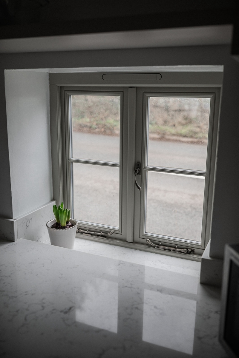 The design remains sympathetic to the cottage setting. An oak feature mantel adds warmth and character, and natural materials run throughout to create a calm and welcoming feel.