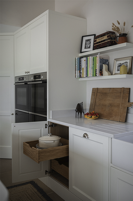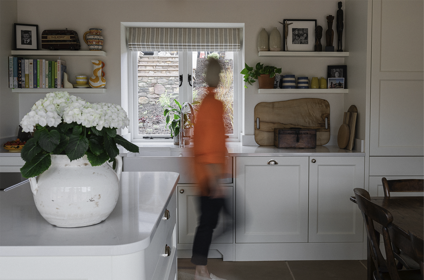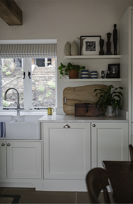The owners’ passion for photography, art, and travel shines through every room, giving the interiors rich character and a welcoming feel. Treasures and much-loved ornaments gathered over the years and on their travels decorate the open floating shelves on either side of the Belfast sink.