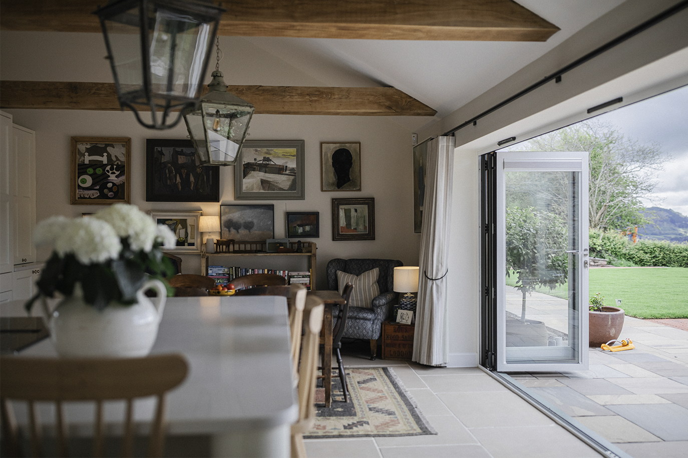 Hidden down a quiet track and across open fields, with no overlooking neighbours, sits this beautifully considered barn-and-cottage renovation. From here, the views sweep across the rural landscape all the way to the Sugar Loaf, just outside Abergavenny.