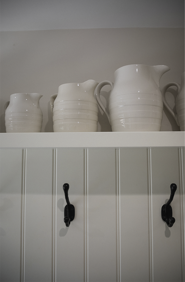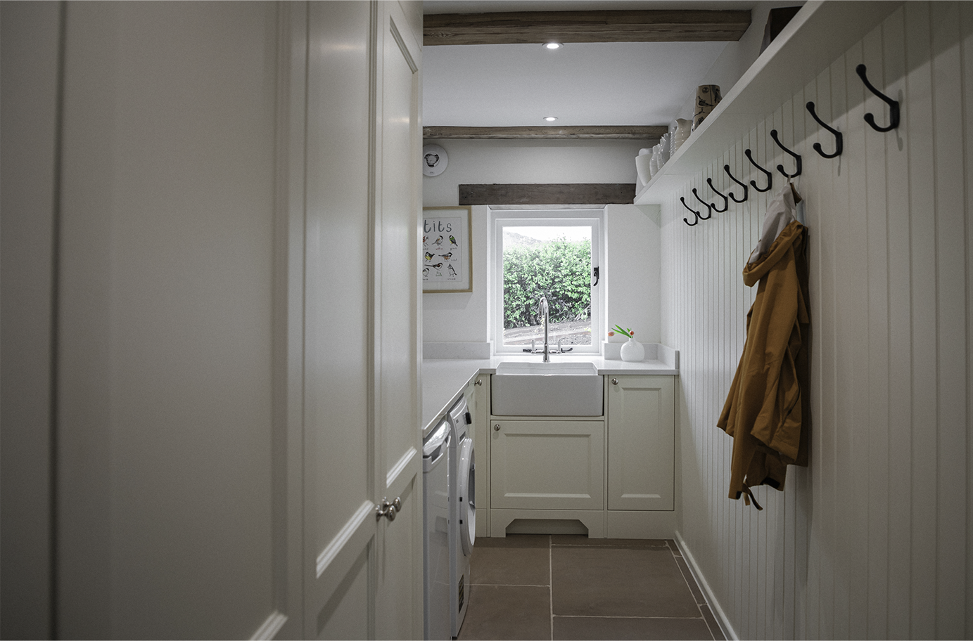 The utility room sits in the centre of the home, tucked neatly under the staircase. Floor-to-ceiling cabinetry offers generous storage for outdoor wear and equipment, while Tongue and Groove panelling adds texture to the walls. Black metal coat hooks and a shelf above display their collection of jugs.