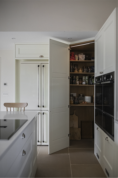 A generous walk-in corner larder and in-folding dry store, combined with extra-wide, deep drawers, provide abundant storage. The large central island not only offers ample preparation space but also serves as a sociable focal point, allowing guests to sit comfortably around it and admire the view together.