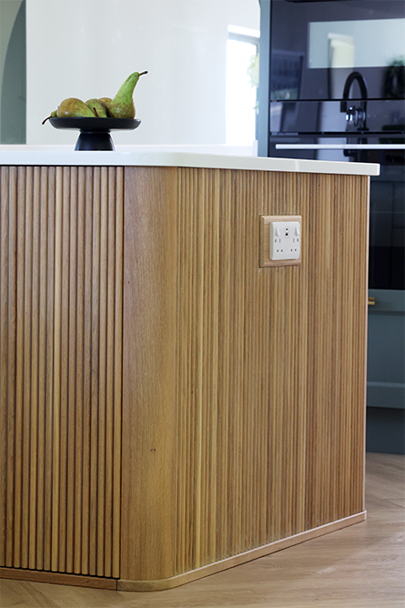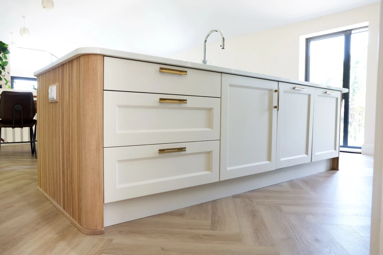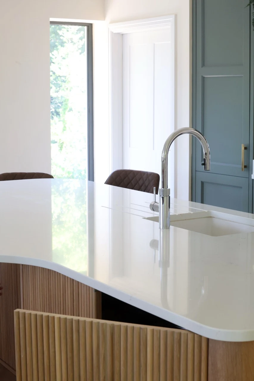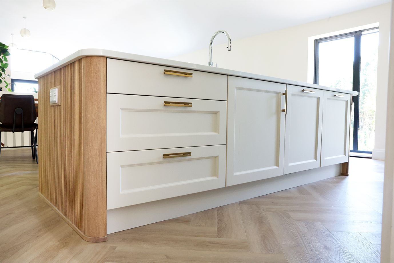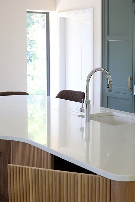 The island is a true statement piece. Each ribbed oak panel has been individually milled and assembled, with hidden push-to-open doors that preserve the clean lines. A curved, scalloped edge elevates the Cosy Stone quartz worktop, giving it a refined finish that’s rarely seen in standard designs. The worktop itself was craned into place over a glass balcony with care by our expert team, due to the living area of the home being on the first floor, a precision installation that reflects the attention to detail at every stage.