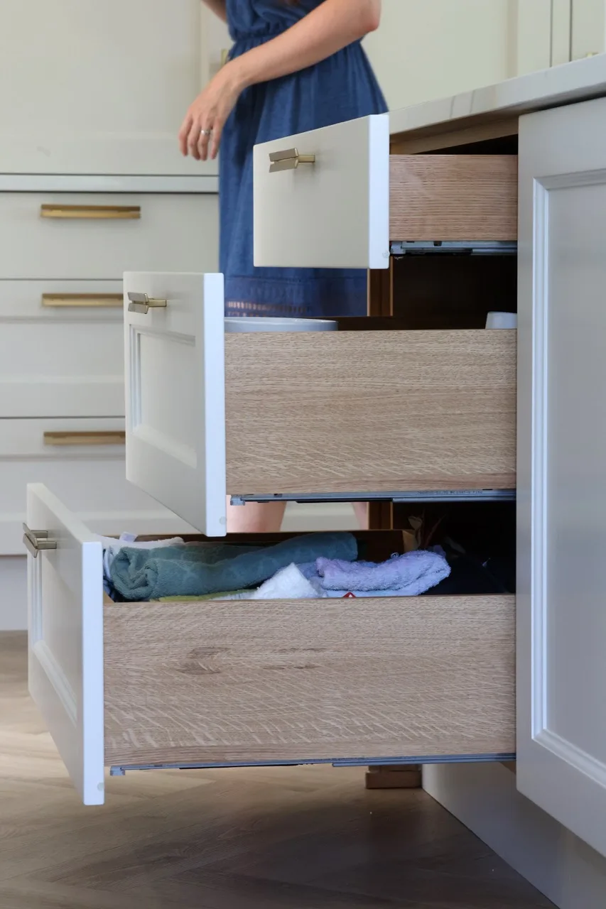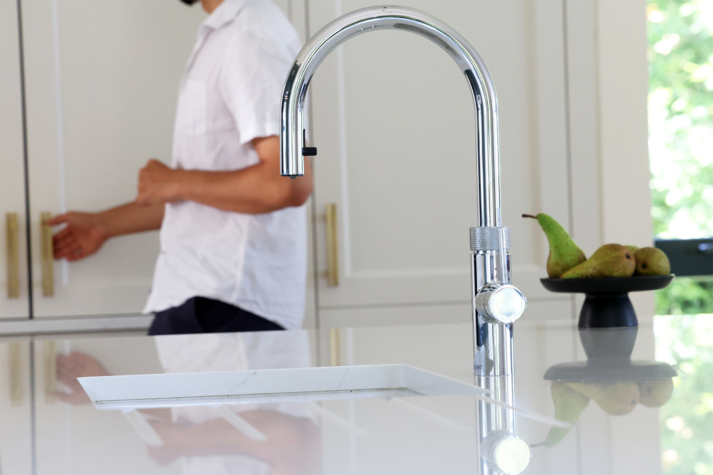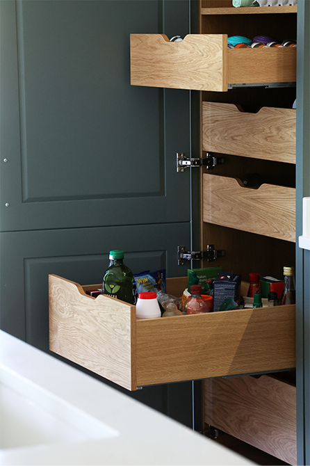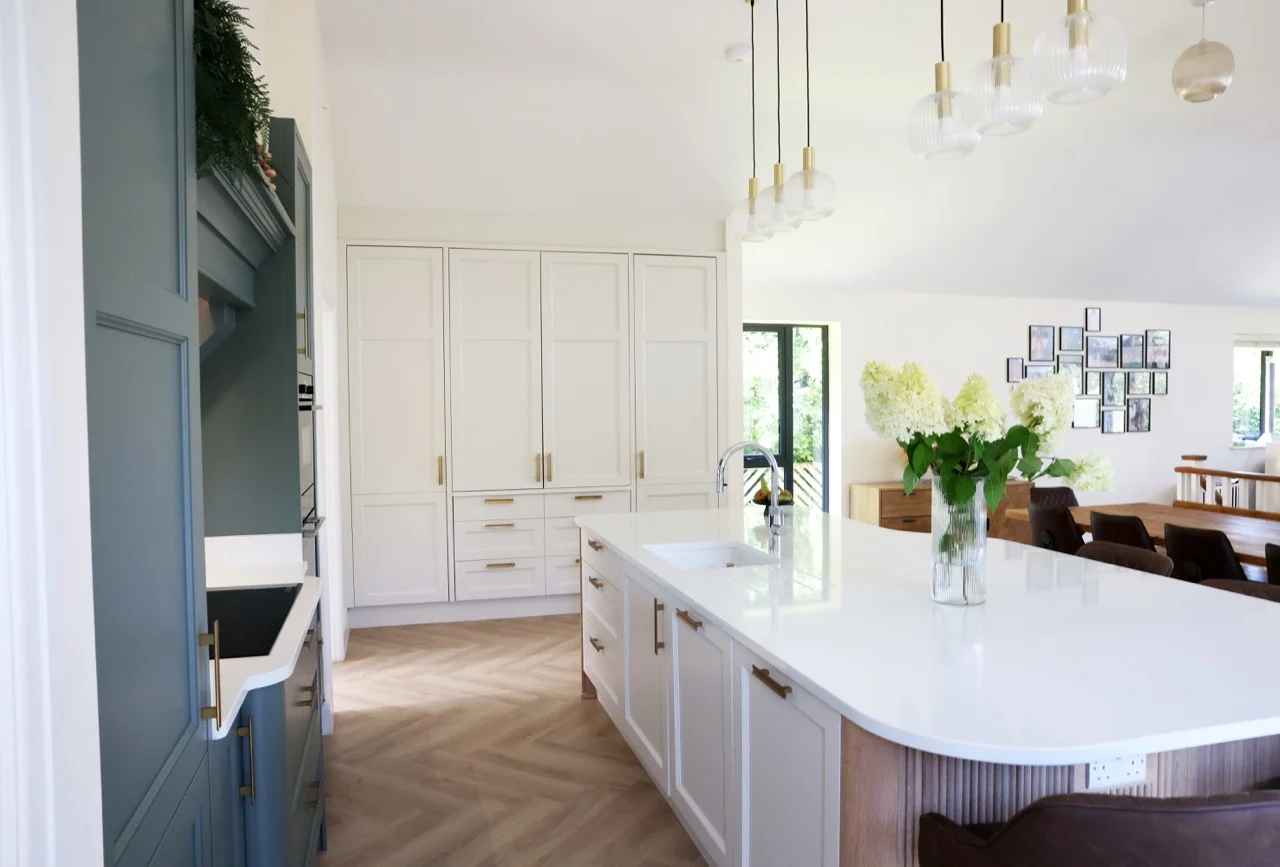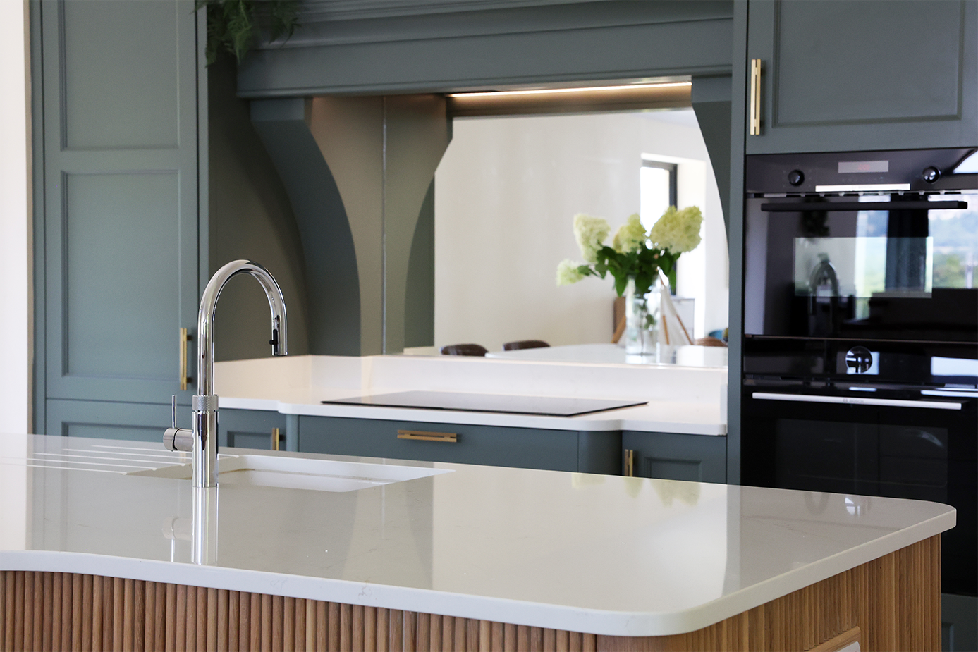 The island is a true statement piece. Each ribbed oak panel has been individually milled and assembled, with hidden push-to-open doors that preserve the clean lines. A curved, scalloped edge elevates the Cosy Stone quartz worktop, giving it a refined finish that’s rarely seen in standard designs. The worktop itself was craned into place over a glass balcony with care by our expert team, due to the living area of the home being on the first floor, a precision installation that reflects the attention to detail at every stage.
